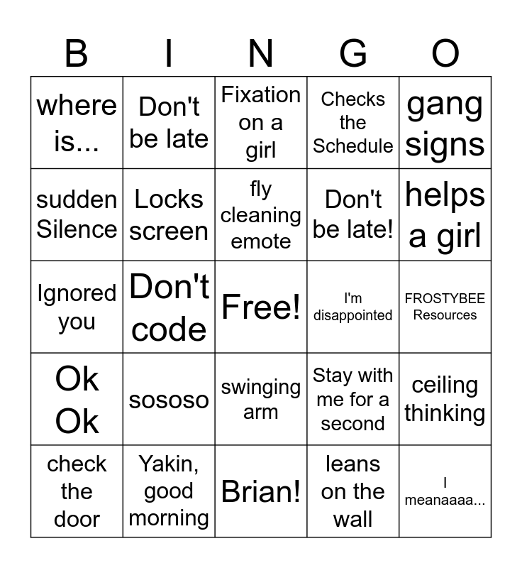 This bingo card has a free space and 24 words: sososo, Yakin, good morning, fly cleaning emote, check the door, gang signs, where is..., sudden Silence, Don't be late, I'm disappointed, swinging arm, Don't be late!, Ignored you, Stay with me for a second, ceiling thinking, Locks screen, leans on the wall, FROSTYBEE Resources, Fixation on a girl, helps a girl, Don't code, I meanaaaa..., Ok Ok, Checks the Schedule and Brian!.