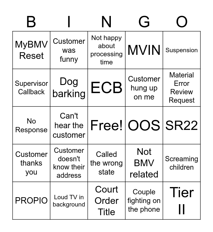 This bingo card has a free space and 24 words: Customer doesn't know their address, Loud TV in background, ECB, PROPIO, Suspension, MyBMV Reset, Supervisor Callback, Customer was funny, OOS, Called the wrong state, Customer hung up on me, No Response, Not BMV related, Screaming children, Dog barking, Couple fighting on the phone, SR22, Not happy about processing time, Material Error Review Request, Can't hear the customer, Tier II, Customer thanks you, MVIN and Court Order Title.