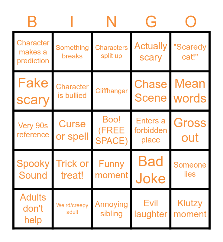 This bingo card has a free space and 24 words: Trick or treat!, Weird/creepy adult, Cliffhanger, Adults don't help, "Scaredy cat!", Character makes a prediction, Fake scary, Something breaks, Enters a forbidden place, Funny moment, Chase Scene, Very 90s reference, Bad Joke, Someone lies, Character is bullied, Evil laughter, Gross out, Characters split up, Mean words, Curse or spell, Klutzy moment, Spooky Sound, Actually scary and Annoying sibling.