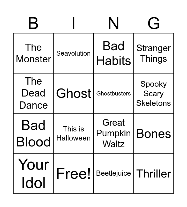 This bingo card has 16 words: Free!, Bones, Bad Habits, The Monster, Bad Blood, Seavolution, Great Pumpkin Waltz, Beetlejuice, The Dead Dance, Ghost, Your Idol, Stranger Things, This is Halloween, Spooky Scary Skeletons, Ghostbusters and Thriller.