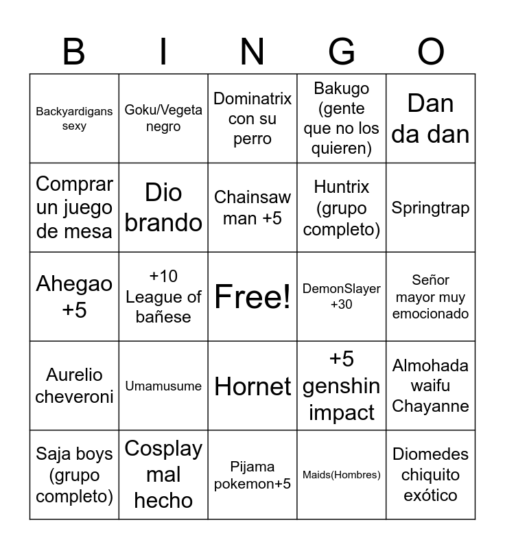 This bingo card has a free space and 24 words: Umamusume, Cosplay mal hecho, Chainsaw man +5, Saja boys (grupo completo), Dan da dan, Backyardigans sexy, Comprar un juego de mesa, Goku/Vegeta negro, DemonSlayer +30, Hornet, Huntrix (grupo completo), Ahegao +5, +5 genshin impact, Almohada waifu Chayanne, Dio brando, Maids(Hombres), Señor mayor muy emocionado, Dominatrix con su perro, Springtrap, +10 League of bañese, Diomedes chiquito exótico, Aurelio cheveroni, Bakugo (gente que no los quieren) and Pijama pokemon+5.
