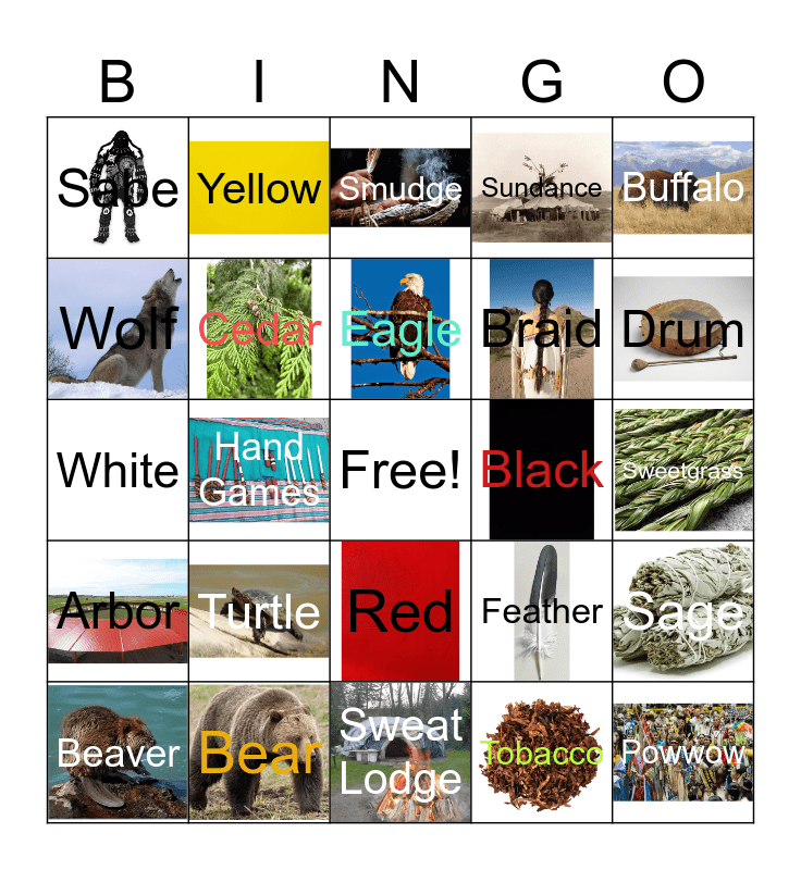 This bingo card has 23 images, a free space and 24 words: Turtle, Bear, Eagle, Beaver, Buffalo, Sabe, Wolf, Yellow, Black, Red, Braid, White, Feather, Sage, Cedar, Tobacco, Sweetgrass, Smudge, Drum, Hand Games, Powwow, Arbor, Sundance and Sweat Lodge.