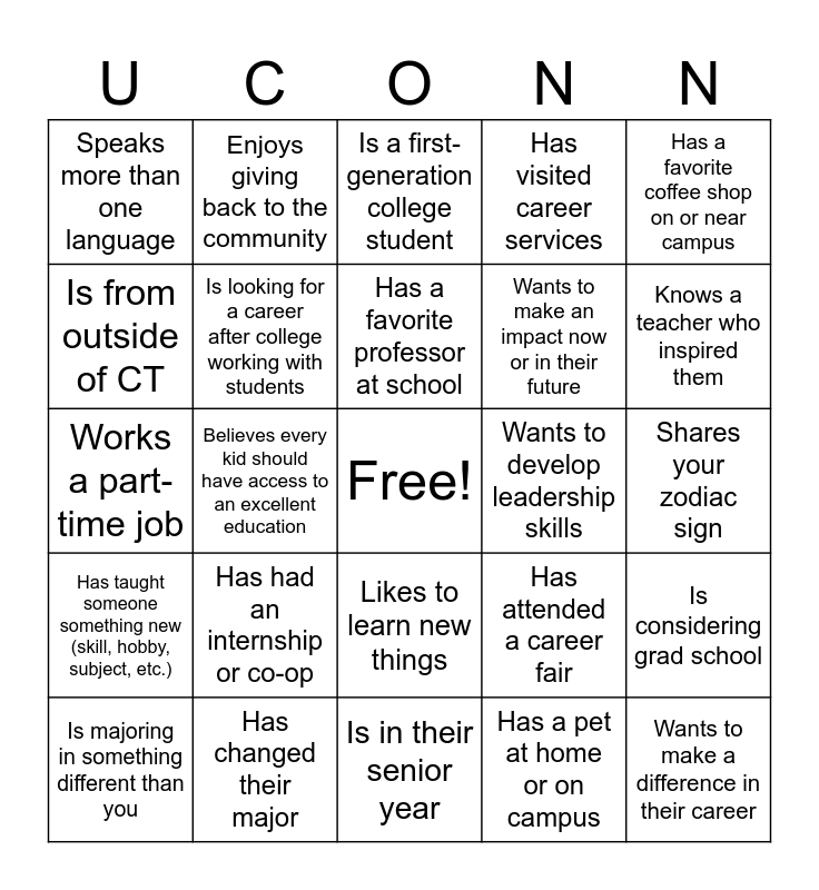 This bingo card has a free space and 24 words: Has had an internship or co-op, Has changed their major, Has a favorite professor at school, Is majoring in something different than you, Has a favorite coffee shop on or near campus, Speaks more than one language, Is from outside of CT, Enjoys giving back to the community, Wants to develop leadership skills, Likes to learn new things, Wants to make an impact now or in their future, Works a part-time job, Has attended a career fair, Is considering grad school, Is looking for a career after college working with students, Has a pet at home or on campus, Shares your zodiac sign, Is a first-generation college student, Knows a teacher who inspired them, Believes every kid should have access to an excellent education, Wants to make a difference in their career, Has taught someone something new (skill, hobby, subject, etc.), Has visited career services and Is in their senior year.