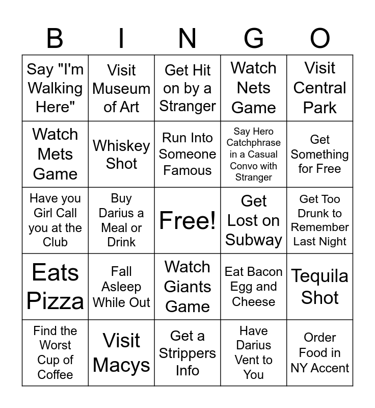 This bingo card has a free space and 54 words: Rat On Train, Eats Pizza, Times Square, Watch Jets Game, Watch Giants Game, Watch Knicks Game, Watch Nets Game, Watch Yankees Game, Watch Mets Game, Take a Taxi, Say "I'm Walking Here", Wear Timbs, Visit Macys, Find the Worst Cup of Coffee, Get a Lapdance, Get a Strippers Info, Order Food in NY Accent, Say Hero Catchphrase in a Casual Convo with Stranger, Have a Stranger Curse You Out, Get Too Drunk to Remember Last Night, Eat Bacon Egg and Cheese, Ride Subway, Get Lost on Subway, Visit Central Park, Get Robbed, Visit Museum of Art, Take an Edible, Hit a Dab Pen, Blunt, or Joint, Drink Hennessy, Have Darius Vent to You, Buy a Round of Drinks, Buy a Cheesy NY Souvenir, Link Up With a Bridal Party, Have 5 Drinks in One Hour, Get Hit on by a Stranger, Stay Out Past 3 am, Have you Girl Call you at the Club, Tequila Shot, Vodka Shot, Whiskey Shot, Wake Up With No Hangover, Wake Up With Hangover, Convince Someone You're Someone Else, Lose Your Phone or Wallet, Fall Asleep While Out, First One Home, Last One Home, Be the Most Drunk One Night, Run Into Someone Famous, Buy Darius a Meal or Drink, Get Something for Free, Win Laser Tag, Watch Anime and Have your NFL Team Win.
