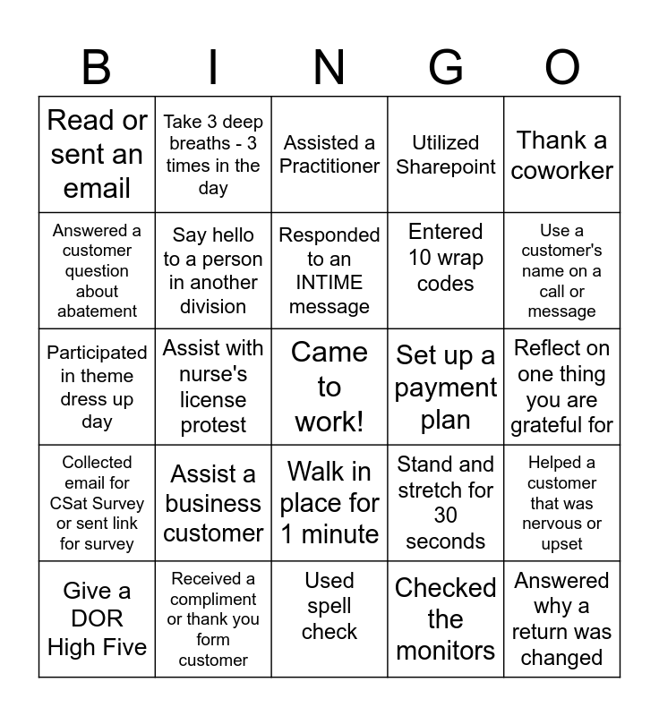 This bingo card has a free space and 24 words: Assist a business customer, Received a compliment or thank you form customer, Responded to an INTIME message, Give a DOR High Five, Thank a coworker, Read or sent an email, Answered a customer question about abatement, Take 3 deep breaths - 3 times in the day, Set up a payment plan, Walk in place for 1 minute, Entered 10 wrap codes, Participated in theme dress up day, Stand and stretch for 30 seconds, Helped a customer that was nervous or upset, Say hello to a person in another division, Checked the monitors, Reflect on one thing you are grateful for, Assisted a Practitioner, Use a customer's name on a call or message, Assist with nurse's license protest, Answered why a return was changed, Collected email for CSat Survey or sent link for survey, Utilized Sharepoint and Used spell check.