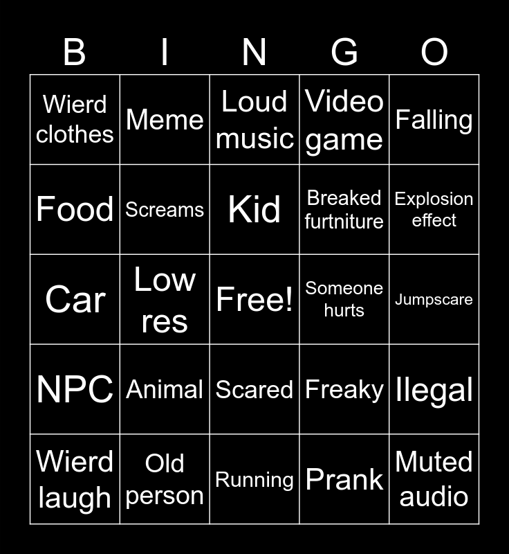 This bingo card has a free space and 24 words: Animal, Old person, Kid, Wierd laugh, Falling, Wierd clothes, Food, Meme, Someone hurts, Scared, Breaked furtniture, Car, Freaky, Ilegal, Screams, Prank, Jumpscare, Loud music, Explosion effect, Low res, Muted audio, NPC, Video game and Running.