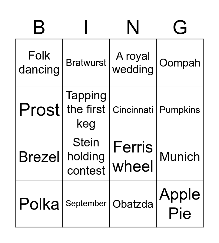 This bingo card has 20 words: Munich, 1810, A royal wedding, Märzen, Polka, Prost, September, Folk dancing, Brezel, Bratwurst, Stein holding contest, Ferris wheel, Tapping the first keg, Apple Pie, Cincinnati, Almonds, Pumpkins, Oompah, Obatzda and Germany.