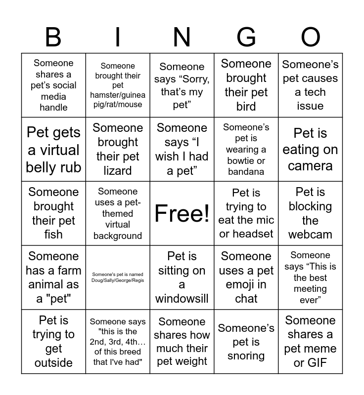 This bingo card has a free space and 77 words: Pet appears on camera, Pet meows/barks during the call, Someone says “Sorry, that’s my pet”, Pet walks across the keyboard, Someone shares a pet photo in chat, Pet gets picked up and shown to the camera, Someone’s pet is sleeping in the background, Pet interrupts a serious moment, Someone’s pet has a funny name, Pet tries to eat something on camera, Someone shares a pet story, Pet wears a costume or accessory, Someone says “I wish I had a pet”, Pet gets a virtual belly rub, Two pets on screen at once, Someone uses a pet-themed virtual background, Pet gets a compliment from a coworker, Someone shares a pet meme or GIF, Pet joins a breakout room, Someone’s pet causes a tech issue, Pet gets a shoutout in the meeting, Someone brought their pet fish, Someone brought their pet lizard, Someone brought their pet hamster/guinea pig/rat/mouse, Someone brought their pet bird, Pet stares directly into the camera, Someone’s pet is louder than the person speaking, Pet tries to climb on their human, Someone apologizes for their pet’s behavior, Someone shares a pet pun, Pet is completely uninterested in the meeting, Someone’s pet is in a carrier or crate, Pet gets startled by a notification sound, Someone uses a pet emoji in chat, Pet is eating on camera, Someone’s pet is wearing a bowtie or bandana, Pet is sitting on someone’s lap, Someone shares a pet adoption story, Pet is blocking the webcam, Someone’s pet is snoring, Pet is licking the screen or camera, Someone’s pet is perched on furniture, Pet is playing with a toy in the background, Someone’s pet is wearing a cone, Pet is in a blanket or bed, Someone’s pet is a rescue, Pet is trying to get outside, Someone shares a pet’s social media handle, Pet is chewing something they shouldn’t, Someone’s pet is a senior, Someone’s pet is a baby/puppy/kitten, Pet is sitting on a windowsill, Someone’s pet is a foster, Pet is wearing a hat, Someone’s pet is a breed you’ve never heard of, Someone shares a pet-themed mug or shirt, Pet is hiding behind furniture, Someone’s pet is named after a food, Someone’s pet is named after a celebrity, Someone’s pet is named after a TV/movie character, Someone's pet is named Doug/Sally/George/Regis, Pet is trying to get into a bag or box, Someone’s pet is a bonded pair, Pet is trying to get attention from another pet, Someone shares a pet’s favorite toy, Pet is in a stroller or backpack, Someone’s pet is a therapy or service animal, Pet is trying to eat the mic or headset, Someone shares a pet’s birthday, Someone’s pet is featured in their profile picture, Pet is reacting to another pet on screen, Someone says “This is the best meeting ever”, Someone has a farm animal as a "pet", Someone says "this is the 2nd, 3rd, 4th… of this breed that I've had", Someone is dressed up to match their pet, Someone shares how much their pet weight and Someone shows off a pet trick.
