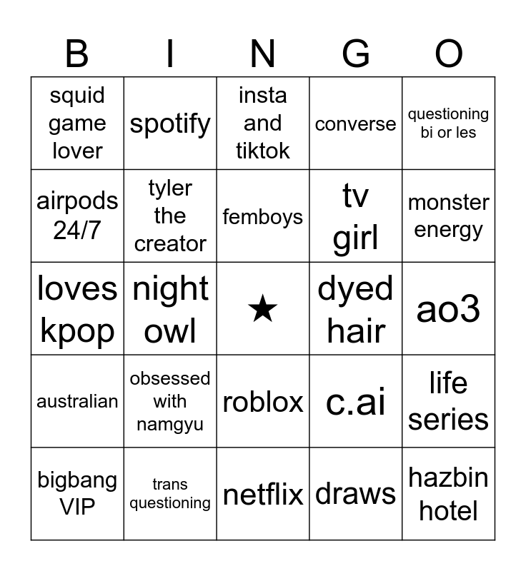 This bingo card has a free space and 24 words: obsessed with namgyu, trans questioning, femboys, bigbang VIP, questioning bi or les, squid game lover, airpods 24/7, spotify, dyed hair, roblox, tv girl, loves kpop, c.ai, life series, tyler the creator, draws, ao3, insta and tiktok, monster energy, night owl, hazbin hotel, australian, converse and netflix.
