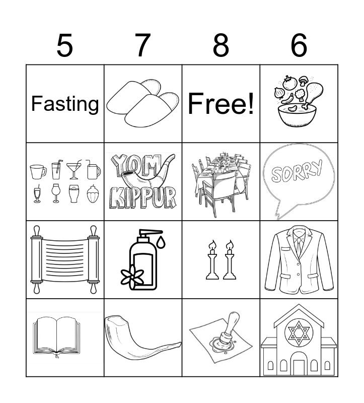This bingo card has 14 images and 2 words: Free! and Fasting.