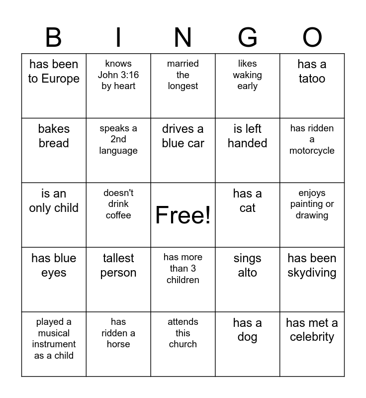 This bingo card has a free space and 24 words: tallest person, has ridden a horse, drives a blue car, played a musical instrument as a child, has a tatoo, has been to Europe, bakes bread, knows John 3:16 by heart, has a cat, has more than 3 children, is left handed, is an only child, sings alto, has been skydiving, speaks a 2nd language, has a dog, enjoys painting or drawing, married the longest, has ridden a motorcycle, doesn't drink coffee, has met a celebrity, has blue eyes, likes waking early and attends this church.