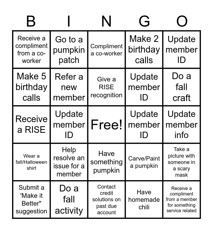 This bingo card has a free space and 24 words: Help resolve an issue for a member, Do a fall activity, Give a RISE recognition, Submit a 'Make it Better" suggestion, Update member ID, Receive a compliment from a co-worker, Make 5 birthday calls, Go to a pumpkin patch, Update member ID, Have something pumpkin, Update member ID, Receive a RISE, Carve/Paint a pumpkin, Take a picture with someone in a scary mask, Refer a new member, Have homemade chili, Update member info, Compliment a co-worker, Do a fall craft, Update member ID, Receive a compliment from a member for something service related, Wear a fall/Halloween shirt, Make 2 birthday calls and Contact credit solutions on past due account.