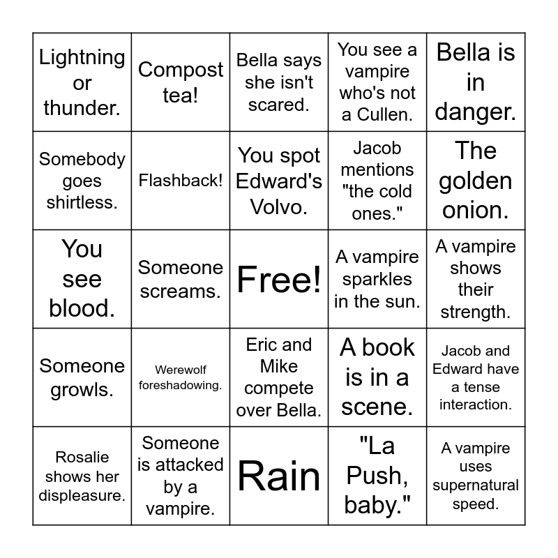 This bingo card has a free space and 24 words: Werewolf foreshadowing., Someone is attacked by a vampire., You spot Edward's Volvo., Rosalie shows her displeasure., Bella is in danger., Lightning or thunder., Somebody goes shirtless., Compost tea!, A vampire sparkles in the sun., Eric and Mike compete over Bella., Jacob mentions "the cold ones.", You see blood., A book is in a scene., Jacob and Edward have a tense interaction., Flashback!, "La Push, baby.", A vampire shows their strength., Bella says she isn't scared., The golden onion., Someone screams., A vampire uses supernatural speed., Someone growls., You see a vampire who's not a Cullen. and Rain.