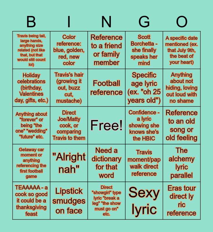 This bingo card has a free space and 24 words: "Alright nah", Lipstick smudges on face, Football reference, TEAAAAA - a cook so good it could be a thanksgiving feast, A specific date mentioned (ex. that July 9th, the beat of your heart), Travis being tall, large hands, anything size related (not like that, but that would still count lol), Holiday celebrations (birthday, Valentines day, gifts, etc.), Color reference: blue, golden, red, new color, Confidence - a lyric showing she knows she's the HBIC, Need a dictionary for that word, Specific age lyric (ex. "oh 25 years old"), Anything about "forever" or being "the one" "wedding" "future" etc., Travis moment/pap walk direct reference, The alchemy lyric parallel, Travis's hair (growing it out, buzz cut, mustache), Sexy lyric, Reference to an old song or old feeling, Reference to a friend or family member, Anything about not hiding, loving out loud with no shame, Direct Joe/Matty cook, or comparing Travis to them, Eras tour direct lyric reference, Getaway car moment or anything referencing the first football game, Scott Borchetta - she finally speaks her mind and Direct "showgirl" type lyric "break a leg" "the show must go on" etc..