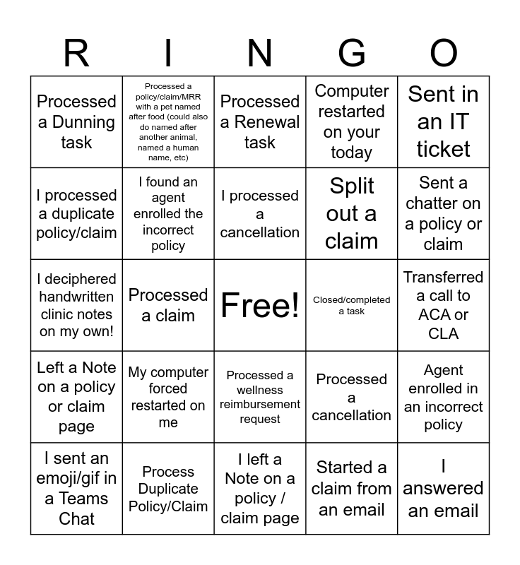 This bingo card has a free space and 70 words: Agent Tattle, Transferred a call to ACA or CLA, Sent an email to a customer, Assisted in a Password Reset, Process Duplicate Policy/Claim, Assist a customer with a claim question, Computer restarted on your today, Answered an email, Sent in an IT ticket, Asked a question in a Teams Chat, Agent enrolled in an incorrect policy, Sent an emoji/gif in a Teams Chat, Processed a Dunning task, Processed a Renewal task, Processed a medical review, Processed a claim, Processed a wellness reimbursement request, Split out a claim, Annoyed a veterinarian clinic for records, Left a Note on a policy or claim page, Closed/completed a task, Processed a cancellation, Sent a chatter on a policy or claim, Assisted a customer with a claim payment, Cleaned out the email inbox, Deciphered handwritten clinic notes on my own!, I assigned additional claims to myself, Received appreciation by a customer/agent/or clinic, Started a claim from an email, PH/clinic said your name wrong, Processed a policy/claim/MRR with a pet named after food (could also do named after another animal, named a human name, etc), Helped a coworker, Gave someone in Care a compliment, Received/processed a fax, Processed a policy/claim/MRR who has the same name as you (pet or PH), I sent an agent tattle, I transferred a call to ACA / CLA, I sent an email to a customer, I assisted in Password Reset, I processed a duplicate policy/claim, I assist a customer with a claim question, My computer forced restarted on me, I answered an email, I sent in an IT ticket, I asked a question in a Teams Chat, I found an agent enrolled the incorrect policy, I sent an emoji/gif in a Teams Chat, I processed a Dunning task, I processed a Renewal task, I processed a medical review, I processed a claim, I processed a reimbursement request, I split out a claim, I annoyed a veterinarian clinic for records, I left a Note on a policy / claim page, I closed/completed a task, I processed a cancellation, I sent a chatter on a policy or claim, I assisted a customer with a claim payment, I cleaned out the email inbox, I deciphered handwritten clinic notes on my own!, I assigned additional claims to myself, I received appreciation by a customer/ agent / clinic, I started a claim from an email, The PH/clinic said my name wrong, I processed a policy / claim/ MRR with a pet named after food / animal / human, I helped a coworker, I gave someone in Care a compliment, I received / processed a fax and I processed a policy / claim / MRR that has the same name as me.