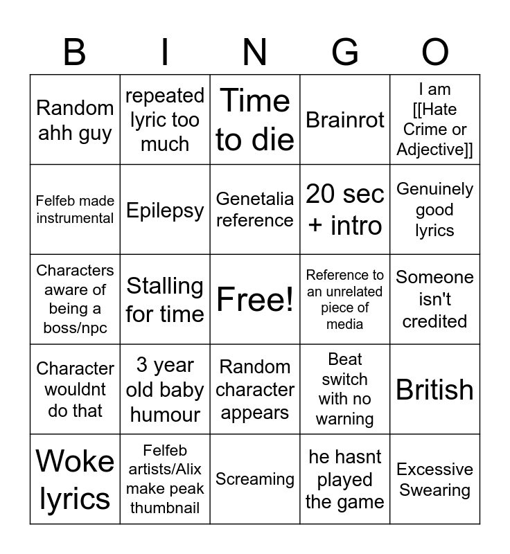 This bingo card has a free space and 38 words: Niche reference, Laughing/Coughing, Stumbling over words, Epilepsy, British, 3 year old baby humour, Genetalia reference, LGBTQ representation, I am [[Hate Crime or Adjective]], 20 sec + intro, Stalling for time, Brainrot, Excessive Swearing, Someone isn't credited, Felfeb made instrumental, Character wouldnt do that, "GUY I AM CHASING AHHHH", Time to die, My name is, Reference to an unrelated piece of media, Random ahh guy, Felfeb artists/Alix make peak thumbnail, Genuinely good lyrics, Woke lyrics, weird outro, Screaming, Gendering an ungendered character, I HATE YOU [[Insert Here]], Reference to gooning/jorkin, Amazing Voice Acting, Name of the game, Random character appears, he hasnt played the game, repeated lyric too much, Amazing Vocals, Beat switch with no warning, Characters aware of being a boss/npc and Background gameplay is insanely good.