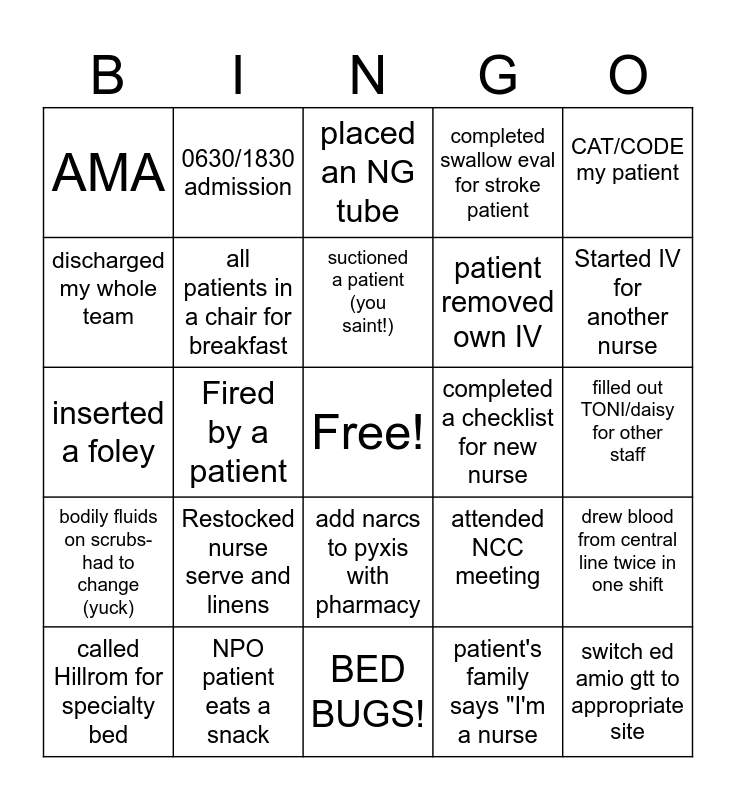 This bingo card has a free space and 34 words: accessed port (or supervisor did it for you)., patient's family says "I'm a nurse, EKG machine doesn't work, stepped in something (though about burning my shoes), bodily fluids on scrubs-had to change (yuck), all patients in a chair for breakfast, CAT/CODE my patient, called Hillrom for specialty bed, 0630/1830 admission, hunted down IV pole, suctioned a patient (you saint!), placed an NG tube, found a wound POA using 4 eyes assessment, Used translator, completed a checklist for new nurse, Started IV for another nurse, NPO patient eats a snack, inserted a foley, Restocked nurse serve and linens, attended NCC meeting, add narcs to pyxis with pharmacy, ambulated my patient in the hallway, AMA, filled out TONI/daisy for other staff, BED BUGS!, switch ed amio gtt to appropriate site, completed swallow eval for stroke patient, added to PCIB (gemba), patient removed own IV, discharged my whole team, 2 admissions in one shift, Fired by a patient, drew blood from central line twice in one shift and transferred patient to ICU.