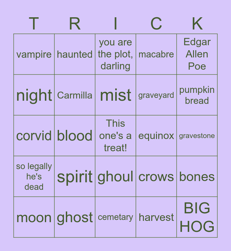 This bingo card has a free space and 24 words: spirit, ghost, mist, moon, Edgar Allen Poe, vampire, night, haunted, equinox, ghoul, graveyard, corvid, crows, bones, Carmilla, harvest, gravestone, you are the plot, darling, pumpkin bread, blood, BIG HOG, so legally he's dead, macabre and cemetary.