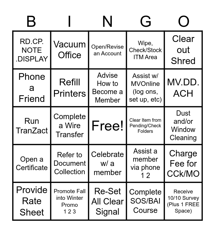 This bingo card has a free space and 24 words: Refer to Document Collection, Promote Fall into Winter Promo 1 2 3, Advise How to Become a Member, Provide Rate Sheet, Clear out Shred, RD.CP. NOTE .DISPLAY, Phone a Friend, Vacuum Office, Clear Item from Pending/Check Folders, Celebrate w/ a member, Assist w/ MVOnline (log ons, set up, etc), Run TranZact, Assist a member via phone 1 2, Charge Fee for CCk/MO, Refill Printers, Complete SOS/BAI Course, Dust and/or Window Cleaning, Open/Revise an Account, MV.DD. ACH, Complete a Wire Transfer, Receive 10/10 Survey (Plus 1 FREE Space), Open a Certificate, Wipe, Check/Stock ITM Area and Re-Set All Clear Signal.