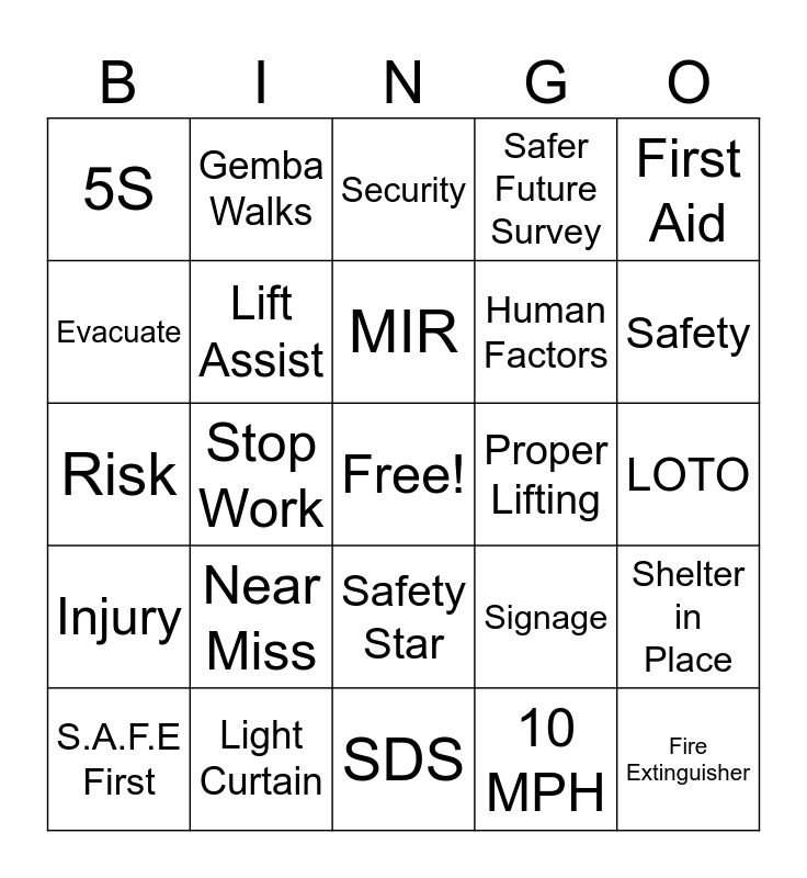 This bingo card has a free space and 29 words: S.A.F.E First, PPE, Stop Work, Ergonomics, 5S, Security, Lift Assist, Near Miss, Proper Lifting, Light Curtain, LOTO, Fire Extinguisher, SDS, 10 MPH, Safety, Biodiversity, Safety Star, Injury, First Aid, Risk, Signage, Recycle, Human Factors, Evacuate, Safer Future Survey, Gemba Walks, Shelter in Place, MIR and OSHA.