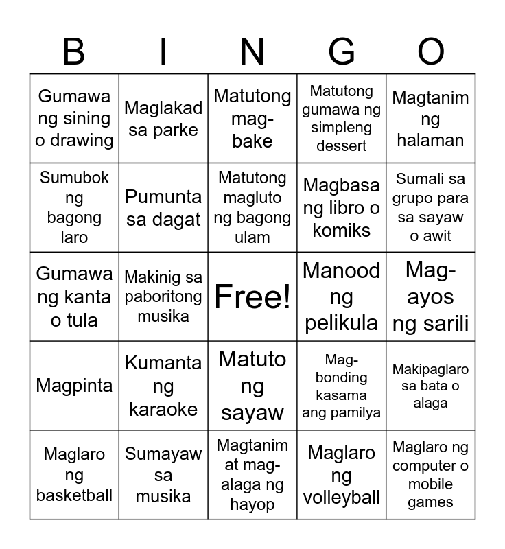 This bingo card has a free space and 24 words: Kumanta ng karaoke, Sumayaw sa musika, Matutong magluto ng bagong ulam, Maglaro ng basketball, Magtanim ng halaman, Gumawa ng sining o drawing, Sumubok ng bagong laro, Maglakad sa parke, Manood ng pelikula, Matuto ng sayaw, Magbasa ng libro o komiks, Gumawa ng kanta o tula, Mag-bonding kasama ang pamilya, Makipaglaro sa bata o alaga, Pumunta sa dagat, Maglaro ng volleyball, Mag-ayos ng sarili, Matutong mag-bake, Sumali sa grupo para sa sayaw o awit, Makinig sa paboritong musika, Maglaro ng computer o mobile games, Magpinta, Matutong gumawa ng simpleng dessert and Magtanim at mag-alaga ng hayop.