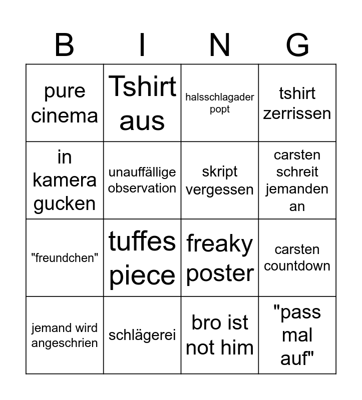 This bingo card has 16 words: schlägerei, carsten countdown, halsschlagader popt, pure cinema, "freundchen", Tshirt aus, freaky poster, bro ist not him, in kamera gucken, unauffällige observation, jemand wird angeschrien, tshirt zerrissen, tuffes piece, carsten schreit jemanden an, skript vergessen and "pass mal auf".