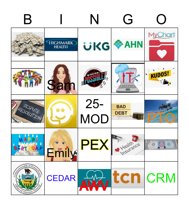 This bingo card has 26 images, a free space and 9 words: Sam, Emily, CEDAR, PTO, CRM, AWV, Bootcamp, PEX and IT.