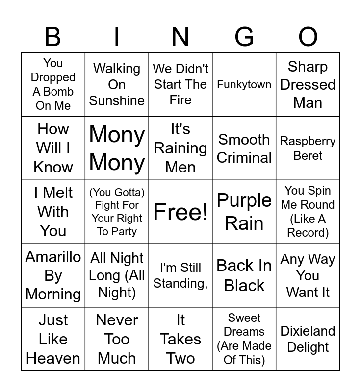 This bingo card has a free space and 52 words: Super Freak (Part 1), Dixieland Delight, Dancing In The Dark, It Takes Two, All Night Long (All Night), Rock With You, Walking On Sunshine, Free Fallin', How Will I Know, Under Pressure, Mony Mony, Let's Dance, Any Way You Want It, Back In Black, Jack & Diane, Red Red Wine, It's Raining Men, Purple Rain, Like A Prayer, Sharp Dressed Man, (You Gotta) Fight For Your Right To Party, Sweet Dreams (Are Made Of This), You Dropped A Bomb On Me, Smooth Criminal, 9 To 5, New York, New York, Time After Time, Jump, Raspberry Beret, Call Me Al, Conga, Funkytown, The Power Of Love, Brass Monkey, Dancing With Myself, We Didn't Start The Fire, Never Too Much, Kokomo, Hit Me With Your Best Shot,, Don't You (Forget About Me), Eye Of The Tiger, You Spin Me Round (Like A Record), Amarillo By Morning, Danger Zone, I'm Still Standing,, The Best, Could You Be Loved, I Melt With You, Deeper Than The Holler, Nothing's Gonna Stop Us Now, Just Like Heaven and Man In The Mirror.
