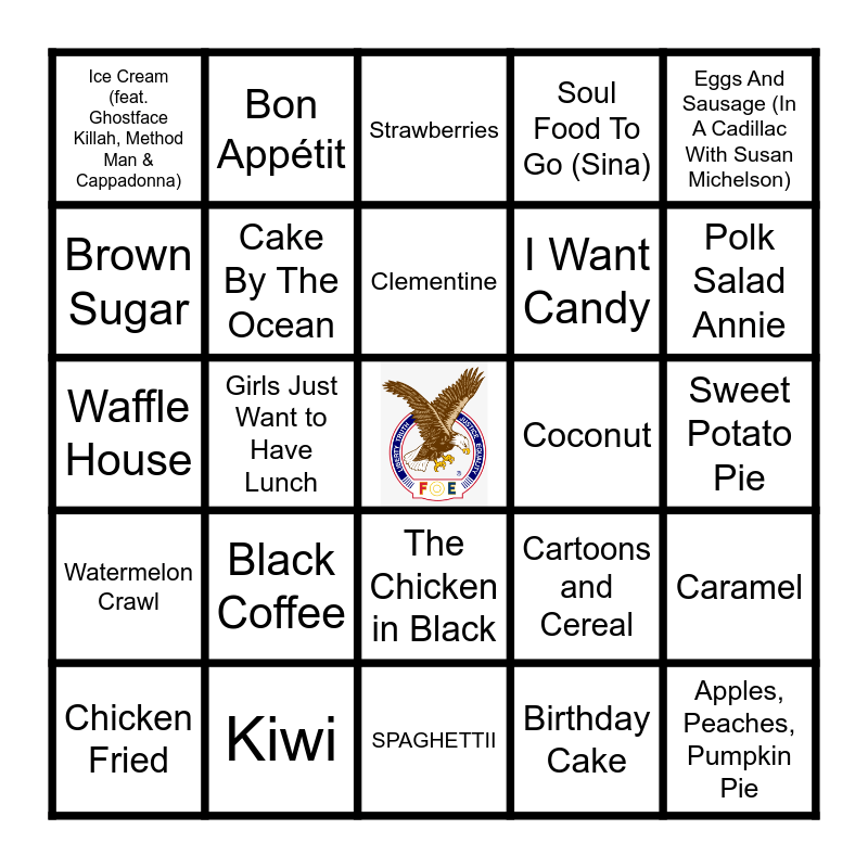 This bingo card has a free space and 53 words: A Little Bit Of Cucumber, Apples, Peaches, Pumpkin Pie, Big Eyed Beans from Venus, Birthday Cake, Black Coffee, Blueberry Hill, Bon Appétit, Bread and Butter, Brown Sugar, Buttered Popcorn, Cake By The Ocean, Candy Shop, Caramel, Cartoons and Cereal, Cherry Pie, Chicken Fried, Clementine, Coconut, Diced Pineapples, Eggs And Sausage (In A Cadillac With Susan Michelson), Girls Just Want to Have Lunch, Grillin' and Chillin', I Want Candy, Ice Cream (feat. Ghostface Killah, Method Man & Cappadonna), Ice Cream Man - 2015 Remaster, Kiwi, Lemonade, Melon Cake, Milk and Toast and Honey, Polk Salad Annie, Popcorn, Pork And Beans, Pretzel Logic, Raspberry Beret, Saturday Night Fish Fry, Scenes from an Italian Restaurant, Soul Food To Go (Sina), SPAGHETTII, Strawberries, Strawberry Fields Forever, Sugar, Sugar, Suppertime, Sweet Potato Pie, Take an Old Cold 'Tater (and Wait), The Candy Man, The Chicken in Black, Toast And Marmalade For Tea, Waffle, Waffle House, Watermelon Crawl, Watermelon Sugar, Yummy and Yummy, Yummy, Yummy.