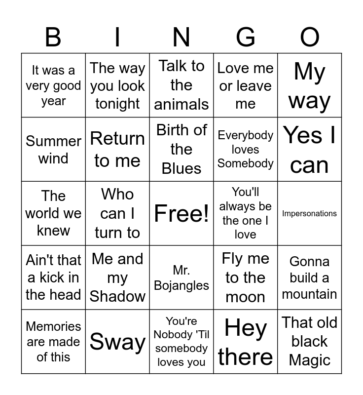 This bingo card has a free space and 42 words: I've gotta be me, Birth of the Blues, What kind of fool am I, Me and my Shadow, Hey there, Gonna build a mountain, That old black Magic, The candy man, Talk to the animals, Mr. Bojangles, Impersonations, Yes I can, Who can I turn to, My way, Somethin' Stupid, Fly me to the moon, That's Life, The world we knew, New York New York, The way you look tonight, Summer wind, Luck be a lady, Chicago, It was a very good year, It had to be you, That's Amore, Everybody loves Somebody, On an evening in Roma, Let it snow let it snow let it snow, Mambo Italiano, Volare, Ain't that a kick in the head, Return to me, You're Nobody 'Til somebody loves you, Dreamy old New England Moon, Memories are made of this, Sway, You'll always be the one I love, Somethings gotta give, Feeling Good, Love me or leave me and Strangers in the night.