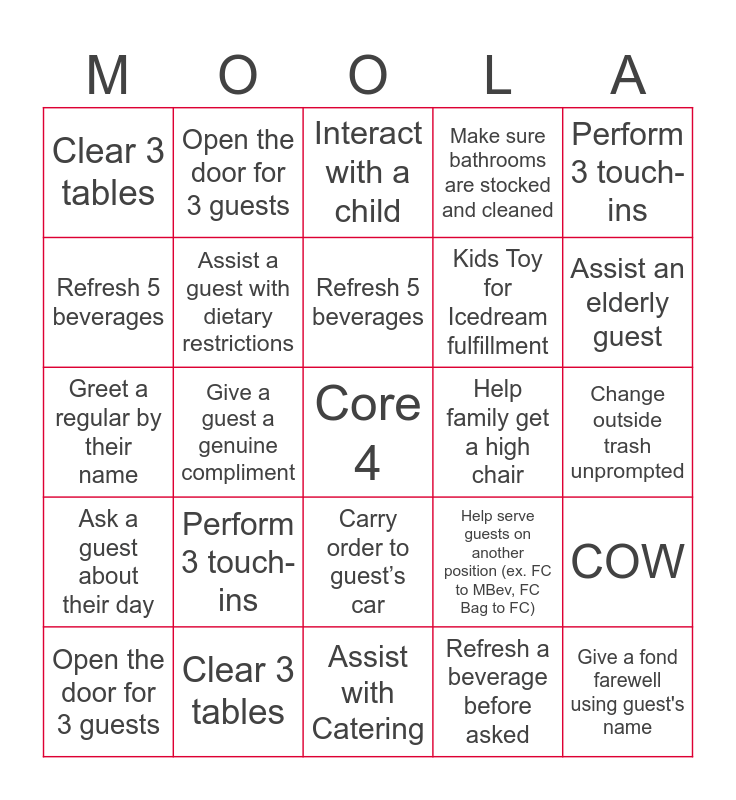 This bingo card has a free space and 24 words: Perform 3 touch-ins, Clear 3 tables, Refresh 5 beverages, Open the door for 3 guests, Perform 3 touch-ins, Clear 3 tables, Refresh 5 beverages, Open the door for 3 guests, Help family get a high chair, Carry order to guest’s car, Kids Toy for Icedream fulfillment, Greet a regular by their name, Help serve guests on another position (ex. FC to MBev, FC Bag to FC), COW, Assist a guest with dietary restrictions, Refresh a beverage before asked, Change outside trash unprompted, Interact with a child, Assist an elderly guest, Give a guest a genuine compliment, Give a fond farewell using guest's name, Ask a guest about their day, Make sure bathrooms are stocked and cleaned and Assist with Catering.