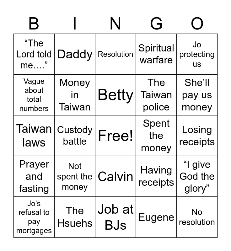 This bingo card has a free space and 26 words: Calvin, Eugene, Betty, The Hsuehs, Jo protecting us, “The Lord told me….”, Vague about total numbers, Daddy, Losing receipts, Having receipts, The Taiwan police, Taiwan laws, “I give God the glory”, Jo’s refusal to pay mortgages, Custody battle, Paying taxes, Spiritual warfare, Prayer and fasting, Resolution, No resolution, She’ll pay us money, Job at BJs, Spent the money, Not spent the money, Money in Taiwan and All money in US.