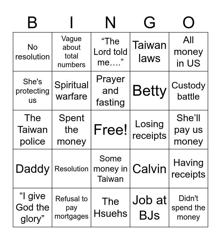 This bingo card has a free space and 27 words: Calvin, Eugene, Betty, The Hsuehs, She's protecting us, “The Lord told me….”, Vague about total numbers, Daddy, Losing receipts, Having receipts, The Taiwan police, Taiwan laws, “I give God the glory”, Refusal to pay mortgages, Custody battle, Any mention of taxes, Spiritual warfare, Prayer and fasting, Resolution, No resolution, She’ll pay us money, Job at BJs, Spent the money, Didn't spend the money, Some money in Taiwan, All money in US and She needs more time.