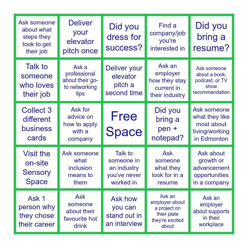 This bingo card has a free space and 24 words: Ask someone what inclusion means to them, Ask someone about their favourite hot drink, Deliver your elevator pitch a second time, Ask 1 person why they chose their career, Did you bring a resume?, Ask someone about what steps they took to get their job, Talk to someone who loves their job, Deliver your elevator pitch once, Did you bring a pen + notepad?, Talk to someone in an industry you've never worked in, Ask an employer how they stay current in their industry, Collect 3 different business cards, Ask someone what they look for in a resume, Ask about growth or advancement opportunities in a company, Ask a professional about their go-to networking tips, Ask an employer about a project on their plate they're excited about, Ask someone what they like most about living/working in Edmonton, Did you dress for success?, Ask someone about a book, podcast, or TV show recommendation, Ask for advice on how to apply with a company, Ask an employer about supports in their workplace, Visit the on-site Sensory Space, Find a company/job you're interested in and Ask how you can stand out in an interview.