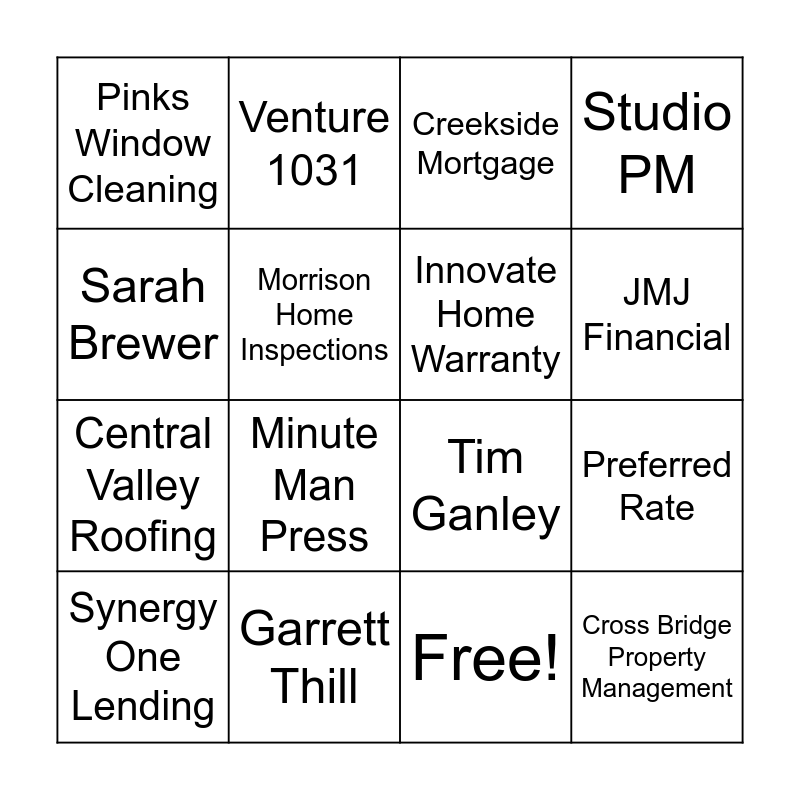 This bingo card has 17 words: Free!, Synergy One Lending, Creekside Mortgage, Pinks Window Cleaning, Minute Man Press, Studio PM, Preferred Rate, Innovate Home Warranty, JMJ Financial, Morrison Home Inspections, Garrett Thill, Tim Ganley, Sarah Brewer, Venture 1031, Central Valley Roofing, The Lindsley Agency and Cross Bridge Property Management.