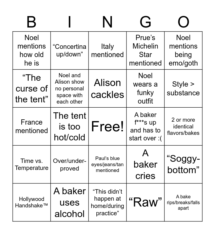 This bingo card has a free space and 39 words: “stodgy”, Prue says “triumph”, A sexual joke is made, Noel and Alison show no personal space with each other, Hollywood Handshake™️, Paul’s blue eyes/jeans/tan mentioned, Alison cackles, Hollywood Non-Handshake™️, Noel mentions being emo/goth, Time vs. Temperature, The tent is too hot/cold, Prue’s Michelin Star mentioned, A bake rips/breaks/falls apart, 2 or more identical flavors/bakes, A baker f***s up and has to start over :(, Over/under-proved, Little to no recipe given for the technical, Noel mentions how old he is, Gay/Queerness mentioned, A baker cries, “The curse of the tent”, “This didn’t happen at home/during practice”, Noel wears a funky outfit, Style > substance, Alison says “BEEAKE”, Prue absolutely annihilates a baker, Alison is a hopeless romantic, Noel/Alison makes a bad pun, Paul makes a baker second guess their choices, “Concertina up/down”, Over/Under-baked, “Doughy”, Italy mentioned, A baker uses alcohol, “Raw”, “Claggy”, “Soggy-bottom”, France mentioned and “You could buy that/pastry shop window”.