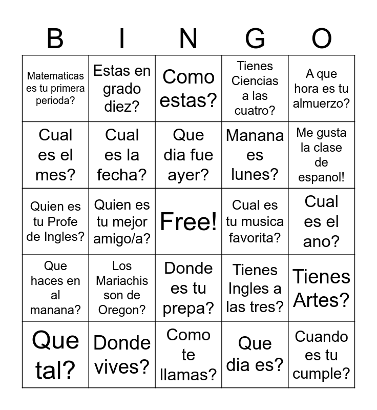 This bingo card has a free space and 24 words: Que tal?, Los Mariachis son de Oregon?, Que dia fue ayer?, Que dia es?, A que hora es tu almuerzo?, Matematicas es tu primera perioda?, Estas en grado diez?, Como estas?, Cual es tu musica favorita?, Cual es el ano?, Quien es tu Profe de Ingles?, Cual es la fecha?, Tienes Ingles a las tres?, Tienes Artes?, Cual es el mes?, Donde vives?, Como te llamas?, Tienes Ciencias a las cuatro?, Me gusta la clase de espanol!, Que haces en al manana?, Quien es tu mejor amigo/a?, Donde es tu prepa?, Manana es lunes? and Cuando es tu cumple?.