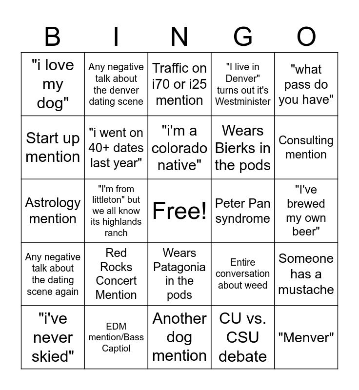 This bingo card has a free space and 24 words: Red Rocks Concert Mention, EDM mention/Bass Captiol, "i'm a colorado native", "i've never skied", "what pass do you have", "i love my dog", Start up mention, Any negative talk about the denver dating scene, Peter Pan syndrome, Wears Patagonia in the pods, Wears Bierks in the pods, Astrology mention, Entire conversation about weed, Someone has a mustache, "i went on 40+ dates last year", CU vs. CSU debate, "I've brewed my own beer", Traffic on i70 or i25 mention, Consulting mention, "I'm from littleton" but we all know its highlands ranch, "Menver", Any negative talk about the dating scene again, "I live in Denver" turns out it's Westminister and Another dog mention.