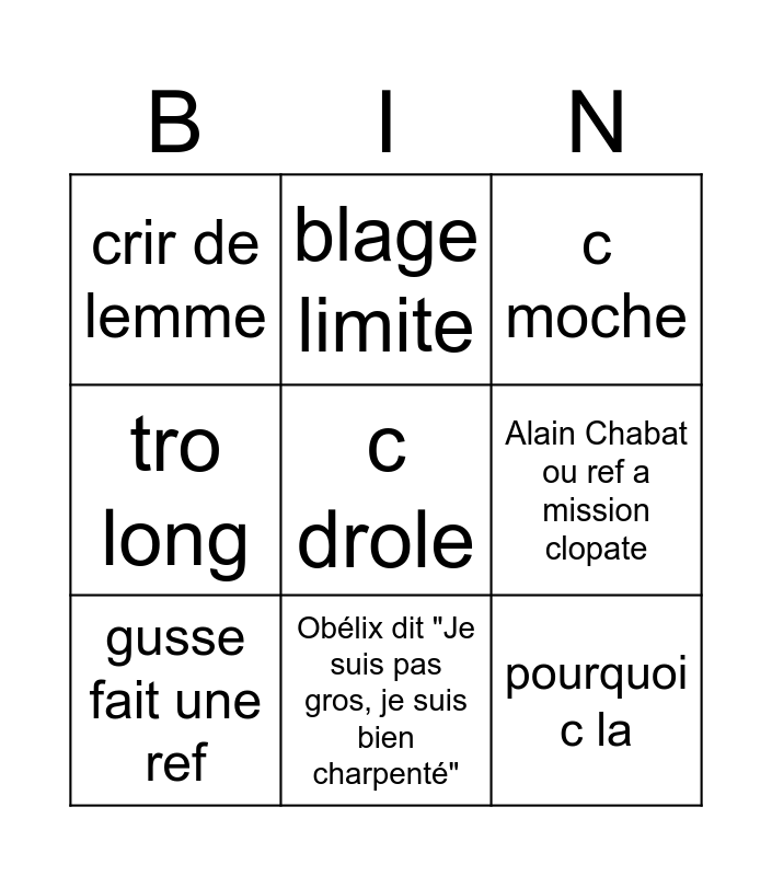 This bingo card has a free space and 8 words: Alain Chabat ou ref a mission clopate, c moche, blage limite, gusse fait une ref, crir de lemme, pourquoi c la, tro long and Obélix dit "Je suis pas gros, je suis bien charpenté".