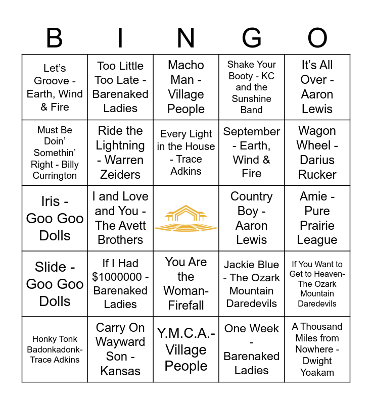 This bingo card has a free space and 53 words: Guitars, Cadillacs- Dwight Yoakam, A Thousand Miles from Nowhere - Dwight Yoakam, Fast as You - Dwight Yoakam, One Week - Barenaked Ladies, If I Had $1000000 - Barenaked Ladies, Pinch Me - Barenaked Ladies, Too Little Too Late - Barenaked Ladies, People Are Crazy - Billy Currington, Must Be Doin’ Somethin’ Right - Billy Currington, Pretty Little Poison - Warren Zeiders, Ride the Lightning - Warren Zeiders, Relapse - Warren Zeiders, If You Want to Get to Heaven-The Ozark Mountain Daredevils, Jackie Blue - The Ozark Mountain Daredevils, You’re Gonna Miss This - Trace Adkins, Honky Tonk Badonkadonk- Trace Adkins, Every Light in the House - Trace Adkins, Country Boy - Aaron Lewis, That Ain’t Country - Aaron Lewis, It’s All Over - Aaron Lewis, I and Love and You - The Avett Brothers, January Wedding - The Avett Brothers, September - Earth, Wind & Fire, Let’s Groove - Earth, Wind & Fire, Shining Star - Earth, Wind & Fire, Carry On Wayward Son - Kansas, Dust in the Wind - Kansas, Hold On Loosely - 38 Special, Rockin’ Into the Night - 38 Special, Wagon Wheel - Darius Rucker, Alright - Darius Rucker, Come Back Song - Darius Rucker, Drops of Jupiter - Train, Hey, Soul Sister - Train, Get Down Tonight - KC and the Sunshine Band, That’s the Way - KC and the Sunshine Band, Shake Your Booty - KC and the Sunshine Band, Y.M.C.A.- Village People, Macho Man - Village People, In the Navy - Village People, Amber - 311, Down - 311, Amie - Pure Prairie League, So Into You - Atlanta Rhythm Section, Imaginary Lover - Atlanta Rhythm Section, You Are the Woman- Firefall, Still the One - Orleans, Dance With Me - Orleans, Iris - Goo Goo Dolls, Slide - Goo Goo Dolls, Name - Goo Goo Dolls, Your man - Josh Turner and Would you go with me - Josh Turner.