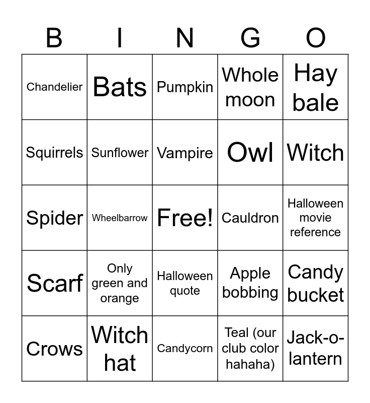 This bingo card has a free space and 42 words: Zombie, Vampire, Black Cat, Only green and orange, Teal (our club color hahaha), Candy bucket, Jack-o-lantern, Ghost, Pumpkin, Halloween quote, Halloween movie reference, Witch, Wheelbarrow, Hay bale, Scarecrow, Apple bobbing, Caramel apple, Spider, Haunted house, Bats, Squirrels, Deer, Candles, Chandelier, Someone in a costume, Fall tree, Owl, Oak leaves, Cobwebs, Acorns, Pie - the food not the number, Scarf, Sunflower, Candycorn, Barn, Crows, Witch hat, Cauldron, Boo, Crescent moon, Whole moon and Fire.