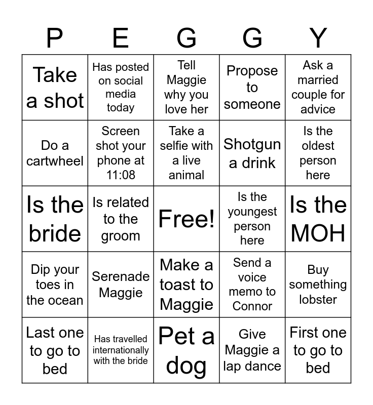 This bingo card has a free space and 24 words: Serenade Maggie, Has travelled internationally with the bride, Take a selfie with a live animal, Last one to go to bed, Ask a married couple for advice, Take a shot, Do a cartwheel, Has posted on social media today, Is the youngest person here, Make a toast to Maggie, Shotgun a drink, Is the bride, Send a voice memo to Connor, Buy something lobster, Screen shot your phone at 11:08, Give Maggie a lap dance, Is the MOH, Tell Maggie why you love her, Is the oldest person here, Is related to the groom, First one to go to bed, Dip your toes in the ocean, Propose to someone and Pet a dog.