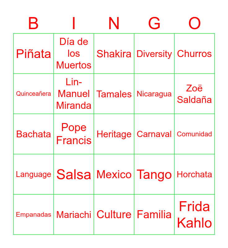 This bingo card has a free space and 24 words: Salsa, Mariachi, Tamales, Empanadas, Churros, Piñata, Quinceañera, Día de los Muertos, Carnaval, Mexico, Nicaragua, Bachata, Tango, Horchata, Lin-Manuel Miranda, Familia, Comunidad, Shakira, Zoë Saldaña, Pope Francis, Frida Kahlo, Language, Diversity and Culture.