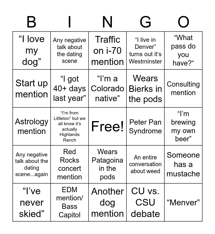 This bingo card has a free space and 24 words: Red Rocks concert mention, EDM mention/ Bass Capitol, “I’m a Colorado native”, “I’ve never skied”, “What pass do you have?“, “I love my dog”, Start up mention, Any negative talk about the dating scene, Peter Pan Syndrome, Wears Patagoina in the pods, Wears Bierks in the pods, Astrology mention, An entire conversation about weed, Someone has a mustache, “I got 40+ days last year”, CU vs. CSU debate, “I’m brewing my own beer”, Traffic on i-70 mention, Consulting mention, “I’m from Littleton” but we all know it’s actually Highlands Ranch, “Menver”, Any negative talk about the dating scene...again, “I live in Denver” turns out it’s Westminster and Another dog mention.