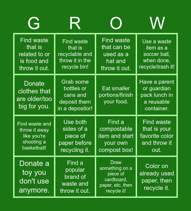 This bingo card has 16 words: Find a popular brand of waste and throw it out., Find waste that is your favorite color and throw it out., Find waste that can be used as a hat and throw it out., Find waste that is related to or is food and throw it out., Find waste and throw it away like you're shooting a basketball!, Find waste that is recyclable and throw it in the recycle bin!, Find a compostable item and start your own compost box!, Draw something on a piece of cardboard, paper, etc, then recycle it!, Donate clothes that are older/too big for you., Grab some bottles or cans and deposit them in a depositor!, Donate a toy you don't use anymore., Use a waste item as a soccer ball, when done, recycle/trash it!, Use both sides of a piece of paper before recycling it., Have a parent or guardian pack lunch in a reusable container., Eat smaller portions/finish your food. and Color on already used paper, then recycle it..