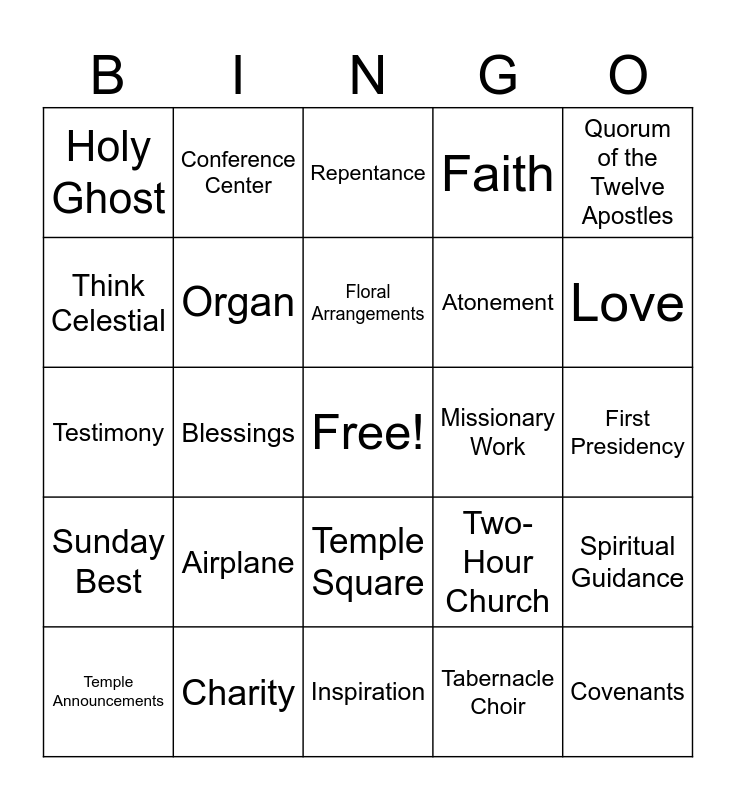 This bingo card has a free space and 24 words: Airplane, Charity, Floral Arrangements, Temple Announcements, Quorum of the Twelve Apostles, Holy Ghost, Think Celestial, Conference Center, Missionary Work, Temple Square, Atonement, Testimony, Two-Hour Church, Spiritual Guidance, Organ, Tabernacle Choir, First Presidency, Repentance, Love, Blessings, Covenants, Sunday Best, Faith and Inspiration.