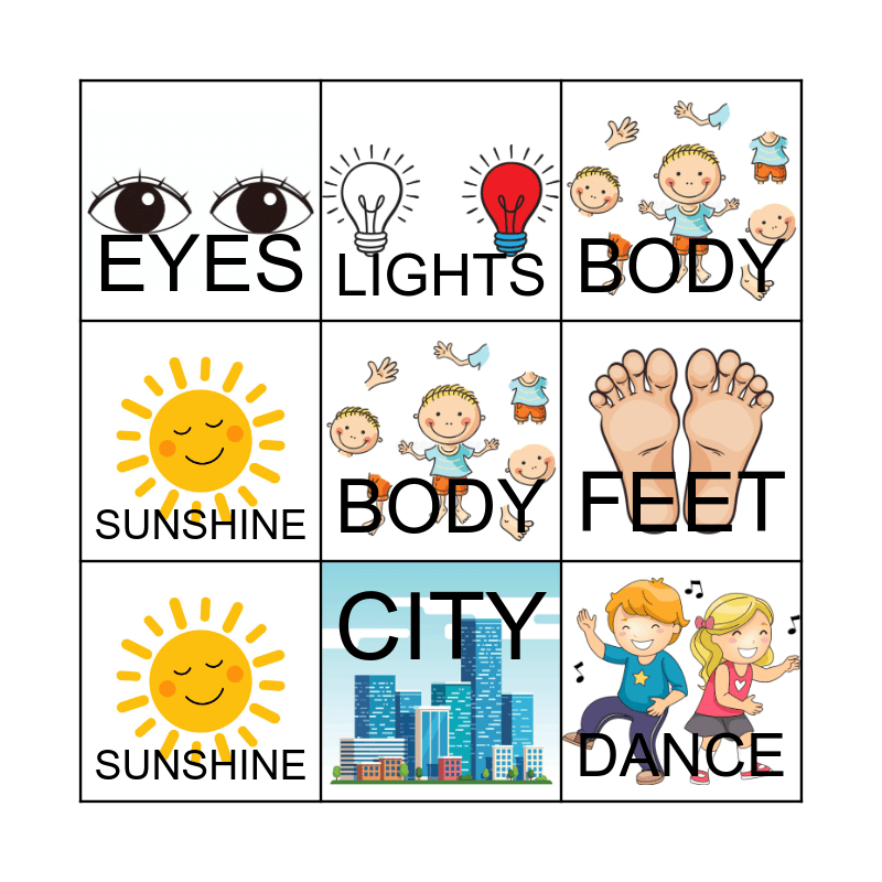 This bingo card has 11 images, a free space and 11 words: BONES, CITY, DANCE, SUNSHINE, LIGHTS, BODY, FEET, STOP, SUNSHINE, EYES and STOP.