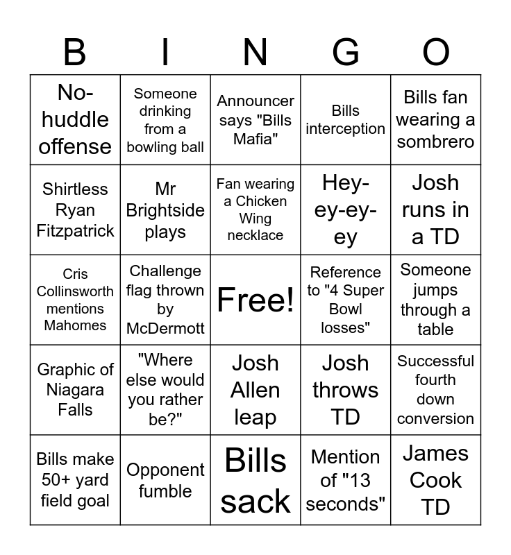 This bingo card has a free space and 24 words: "Where else would you rather be?", Opponent fumble, Fan wearing a Chicken Wing necklace, Bills make 50+ yard field goal, Bills fan wearing a sombrero, No-huddle offense, Shirtless Ryan Fitzpatrick, Someone drinking from a bowling ball, Reference to "4 Super Bowl losses", Josh Allen leap, Hey-ey-ey-ey, Cris Collinsworth mentions Mahomes, Josh throws TD, Successful fourth down conversion, Mr Brightside plays, Mention of "13 seconds", Someone jumps through a table, Announcer says "Bills Mafia", Josh runs in a TD, Challenge flag thrown by McDermott, James Cook TD, Graphic of Niagara Falls, Bills interception and Bills sack.