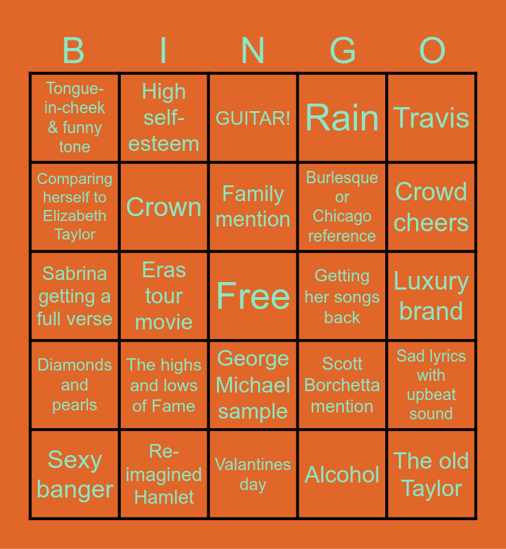 This bingo card has a free space and 24 words: The highs and lows of Fame, Re-imagined Hamlet, Family mention, Sexy banger, Travis, Tongue-in-cheek & funny tone, Comparing herself to Elizabeth Taylor, High self-esteem, Getting her songs back, George Michael sample, Burlesque or Chicago reference, Sabrina getting a full verse, Scott Borchetta mention, Sad lyrics with upbeat sound, Crown, Alcohol, Luxury brand, GUITAR!, Crowd cheers, Eras tour movie, The old Taylor, Diamonds and pearls, Rain and Valantines day.