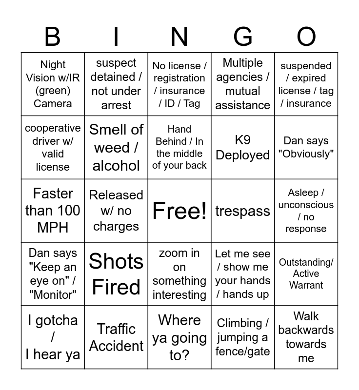 This bingo card has a free space and 24 words: Shots Fired, Traffic Accident, Hand Behind / In the middle of your back, I gotcha / I hear ya, suspended / expired license / tag / insurance, Night Vision w/IR (green) Camera, cooperative driver w/ valid license, suspect detained / not under arrest, trespass, zoom in on something interesting, K9 Deployed, Faster than 100 MPH, Let me see / show me your hands / hands up, Outstanding/ Active Warrant, Smell of weed / alcohol, Climbing / jumping a fence/gate, Asleep / unconscious / no response, No license / registration / insurance / ID / Tag, Dan says "Obviously", Released w/ no charges, Walk backwards towards me, Dan says "Keep an eye on" / "Monitor", Multiple agencies / mutual assistance and Where ya going to?.